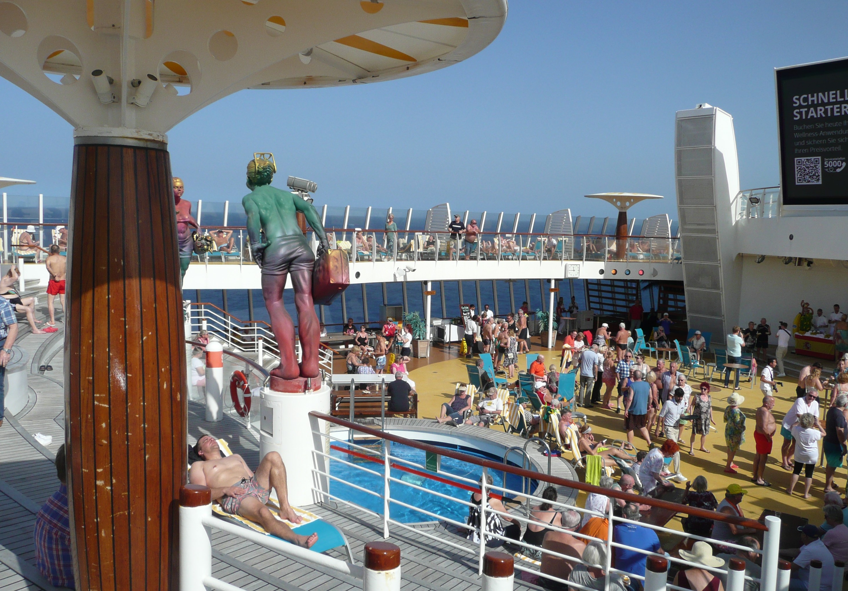 Miejscowa ludność z racji wysokiej temperatury masowo wyległa na najwyższy pokład, gdzie korzysta ze słońca, opalając na czerwono blade skóry.
