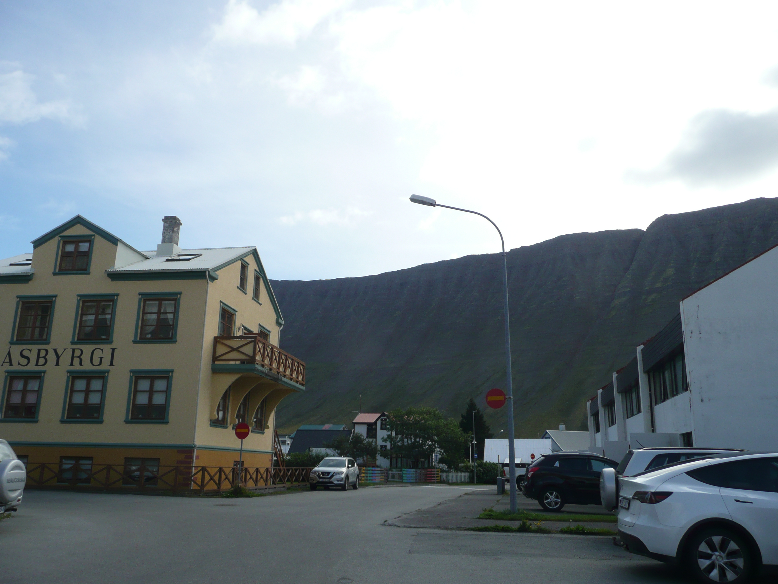 Jeszcze dwie przecznice i miasto właściwie się kończy. Skręcamy tym razem w lewo (koło pizzerii) i znów jesteśmy nad wodami fiordu. / Two more blocks and the city essentially ends. We turn left this time (near the pizzeria) and find ourselves back at the fjord.