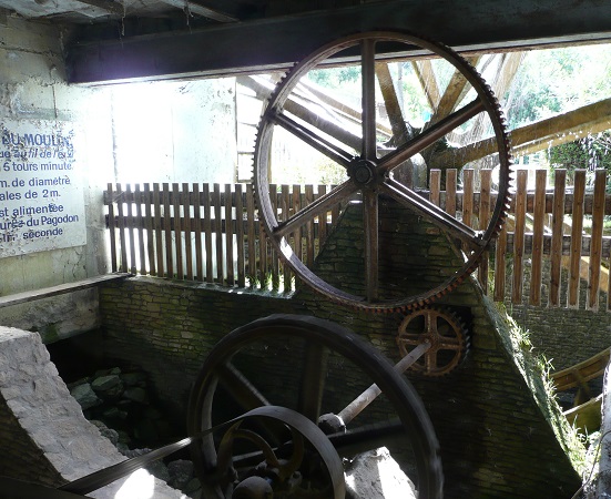 To maszyna, która za pomocą tłoków (?) międli masę papierową w różnych fazach umiędlenia. Właściwie to tylko ta z lewej pracowała. Tam, skąd pada światło są wielkie koła napędzane przez wodę i te koła napędzają z kolei tę skomplikowaną maszynerię na dole.