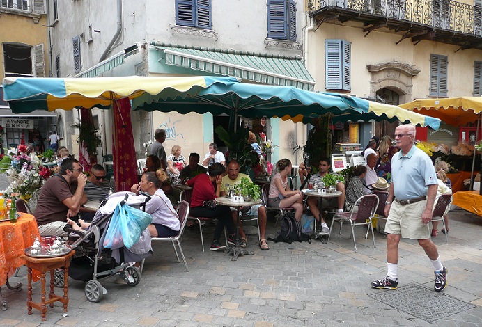 Targ, jak to we Francji, jest otoczony kawiarniami, w których bardzo zapracowani ludzie spędzają mnóstwo czasu na gadaniu, rozgladaniu się dookoła, plotkami i ogólnie pojętym relaksowaniem się wraz z rodziną i znajomymi. Z empirii wiem, że przesiadywanie w kawiarnia, bistro i barach jest sportem narodowym i prawdę mówiąc jest to świetny rodzaj sportu.