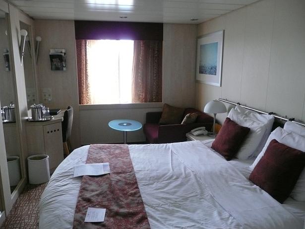Kajuty gotowe. Nasza (i pewnie każda inna) jest śliczna – wielkie łóżko, wielkie okno, na jednej ze ścian wielkie lustra. Trzy szafy, telewizor, biurko szafki z obu stron łóżka (koi?), lampy, telefon – naprawdę nic więcej do szczęścia nie trzeba. Łazienka malutka, ale jest w niejwszystko, co łazienka mieć powinna. Przynajmniej według moich standartów.