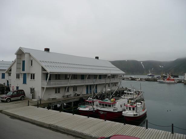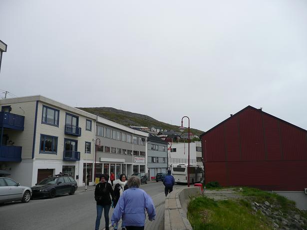 Szalupa przybiła do pomostu prawie przy głównej ulicy. Z bliska Honningswåg nie wygląda już tak uroczo. Jest smutne i szare, składa się z jednej ulicy w której są dziury jak na polskich drogach, a kolorowe domki okazują się nie takie znów kolorowe. Czepiam się, ale jeśli przypływa tu w sezonie te 1000 statków wypełnionych ludźmi i jeśli co piąty z nich zostawi równowartość chociaż 5-ciu euro, to w tej osadzie zostaje co najmniej 5 milionów euro. Mogliby za 10 % tej kasy naprawić tynki, załatać drogę i pomalować paskudne plamy na murach chociaż od strony ulic(y). W niektórych oknach wiszą ładne firanki, stoją jakieś kwiatki czy figurki, a inne są zakryte jakimiś starymi narzutami i innymi paskudnymi szmatami. Miasto mogłoby też zainwestować w jakąś roślinność, bo mieszkańcy hodują w ogródkach chwasty i śmieci różnego pochodzenia.