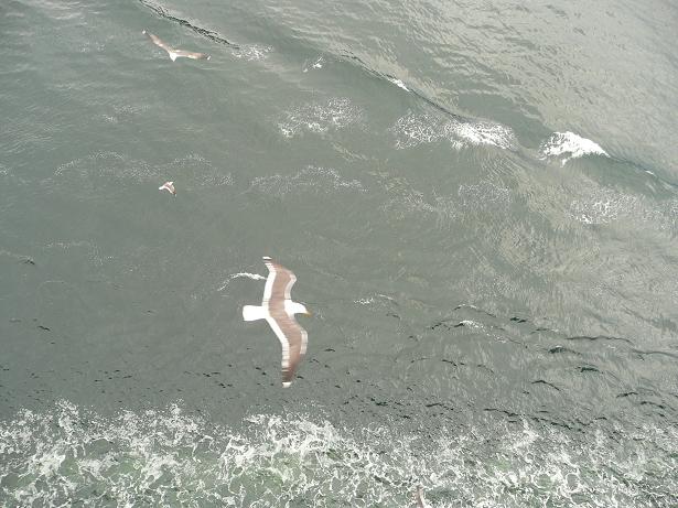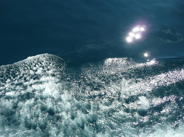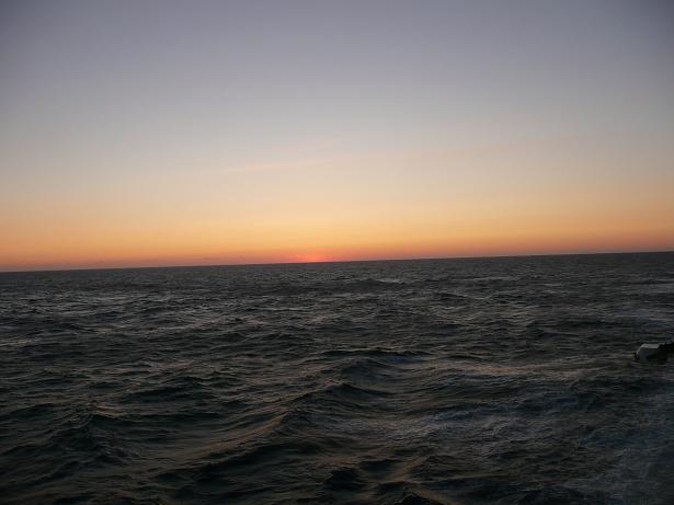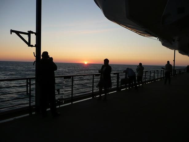 Jak wiecie, przy każdej okazji wypatruję fontanny wody i wielkiego cielska. Siedziałam więc sobie na 10 pokładzie, penetrując wzrokiem powierzchnię morza i nagle wśród ciemnych fal zobaczyłam stado delfinów! Stado miało około 20 sztuk, były prawie czarne. Płynęły bardzo szybko z zachodu na wschód (oczywiście delfinem), wynurzały się tylko na chwilę, a potem było je widać przez moment tuż pod powierzchnią wody. Minęły statek od strony rufy, nie zwracając na niego najmniejszej uwagi, a wszystko to trwało kilkanaście sekund. Nie miałam pojęcia, że są tak szybkie, ale wiedziałam, że są piękne. Rzuciłam się do okna jęcząc z zachwytu, próbując wypatrzeć jakiegoś marudera, ale nie pojawiły się więcej.