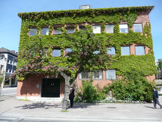 Wracając do Molde (molde/moldar w staronorweskim znaczy czaszka albo żyzna ziemia) i jej róż: sławny ogród różany znajduje się na dachu ratusza jest przereklamowany. Róż jest dużo, ale nie wyglądają imponująco, przypominają zaniedbane badylki zieleniejące się wprawdzie, ale dość nieśmiało. Może trafiłam w zły moment, ale takie badylki nie powinny zostać symbolem miasta.