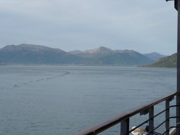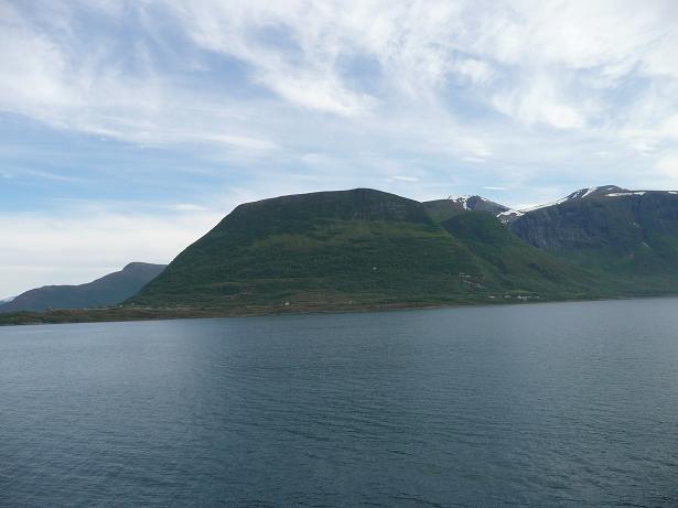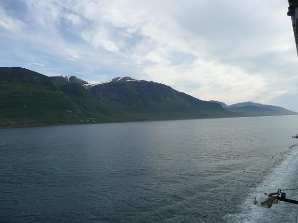 Morze jest niesamowicie gładkie, jakby powierzchnia pokryta była lodem. Na sterburcie ciągle widać wybrzeża Norwegii, a nad nimi białe chmury, które wyglądają jak góry lodowe i to potęguje wrażenie zimna. Nad statkiem znów latają ptaki, za to od wczoraj nie widziałam żadnych statków. Dziś wieczorem przepłyniemy za krąg polarny. I pierwsza noc bez zachodu słońca.